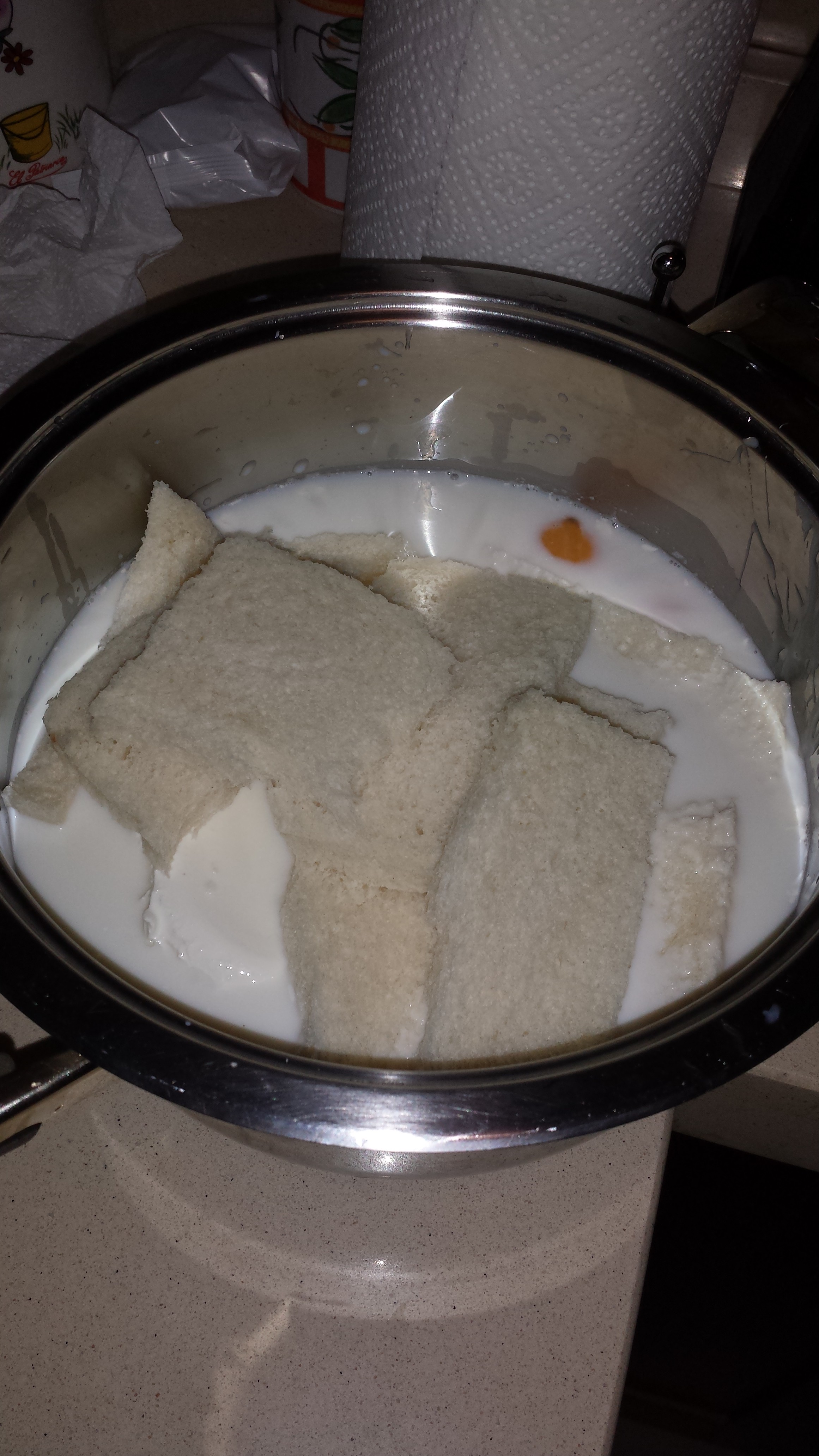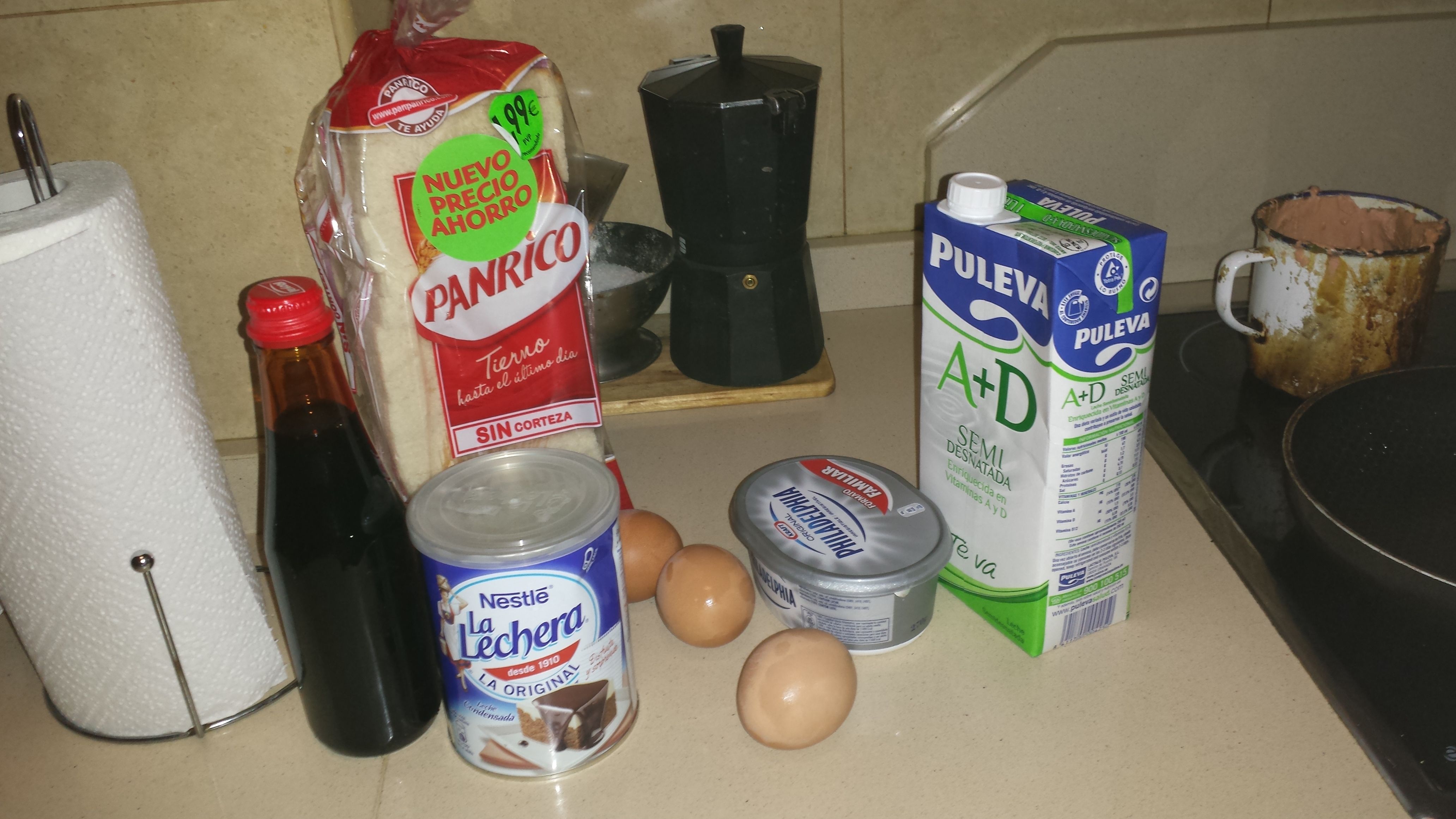 1. En una olla o recipiente grande donde podamos batir sin derramar los ingredientes introducimos la tarrina de queso philadelphia, la lata de leche condensada (suelo dejar aproximademente dos dedos en el bote, no la echo entera), 2 vasos de leche, 3 huevos y las 4 rebanadas de pan bimbo sin corteza y batimos todo perfectamente para que no quede ningún grumito.