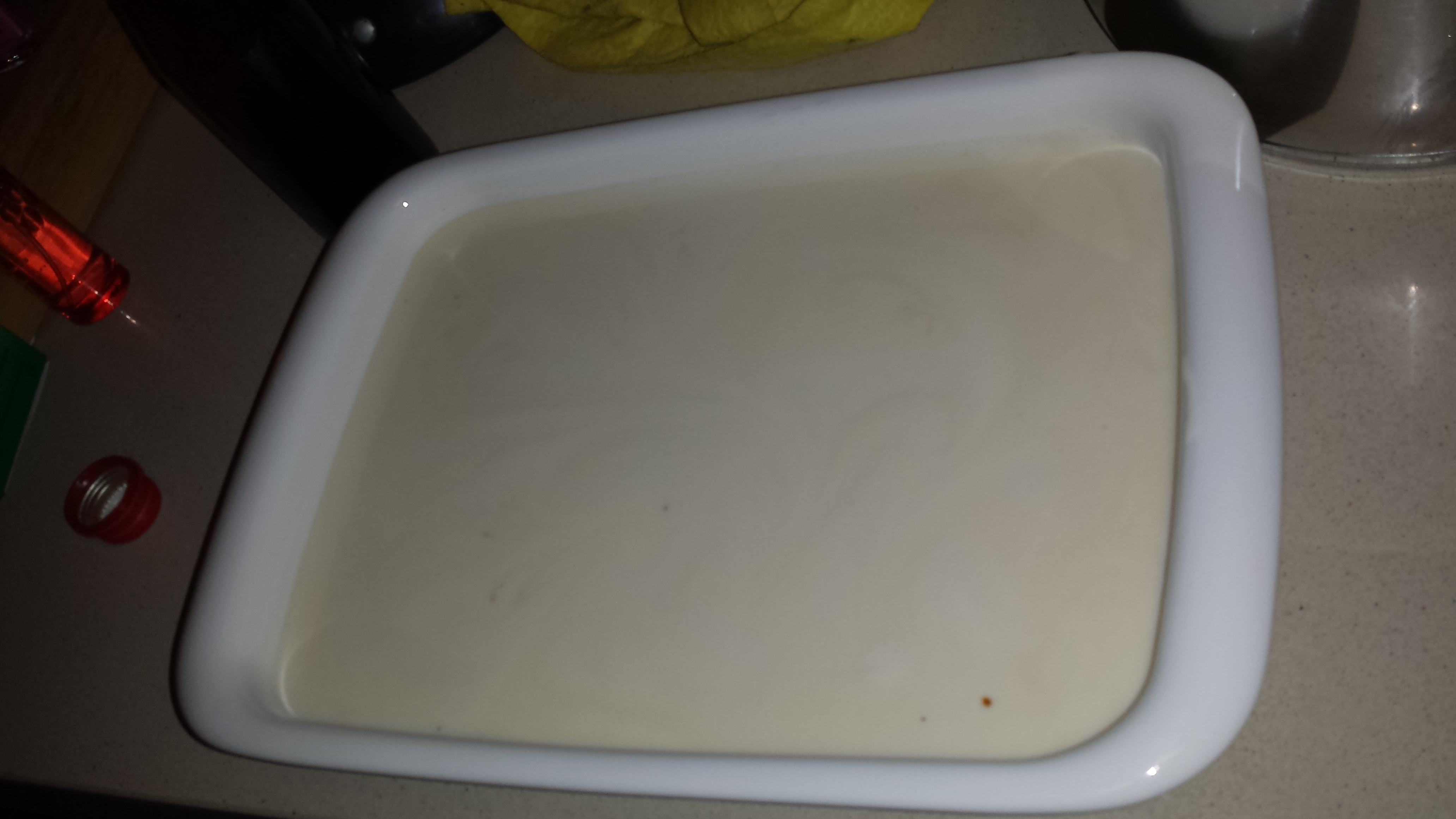 2.Una vez batido todo perfectamente, llenamos la base del recipiente donde vayamos a hacer la tarta, de caramelo. Cuando esté entera cubierta (no hace falta vaciar el bote entero de caramelo, con poco mas de la mitad sobra), echamos la mezcla del resto de ingredientes que acabamos de batir.