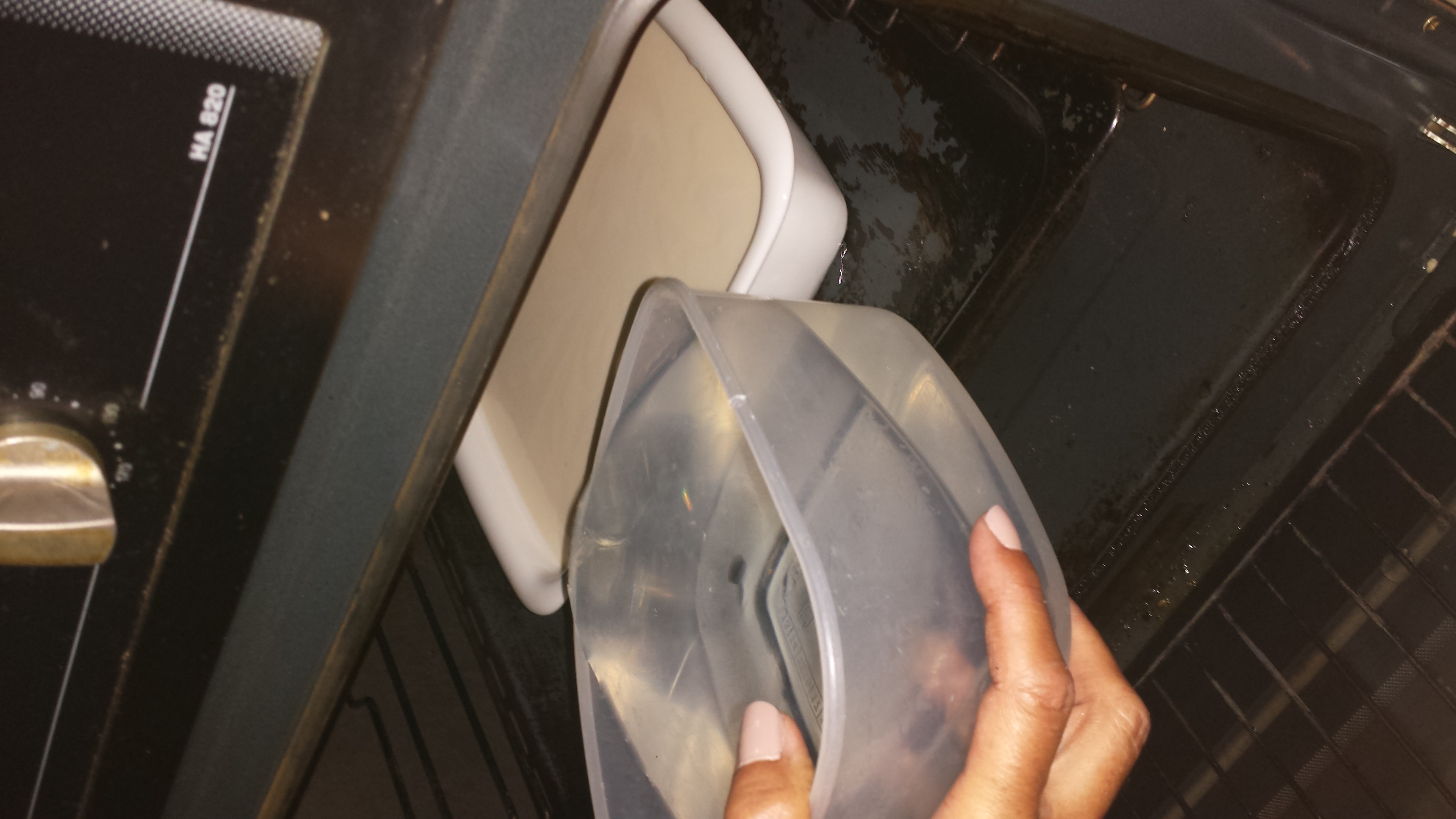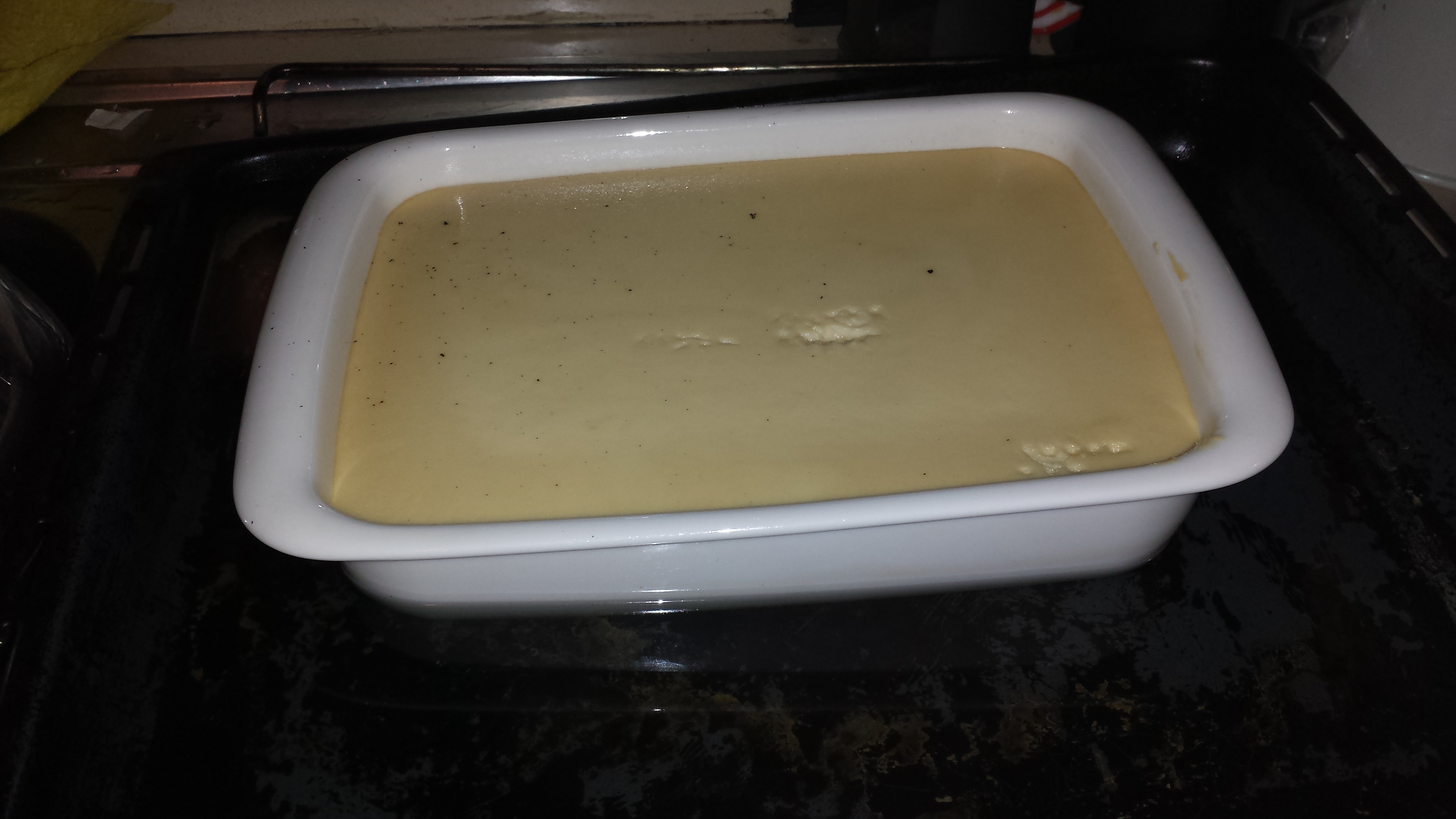 3. Una vez todo echado, metemos el recipiente en el horno (a 180º y solo con el ventilador de abajo) al baño maría. (Yo introduzco el recipiente de la tarta en la bandeja del horno y con otro recipiente lleno de agua voy echándole hasta llenar la bandeja del horno (sin que reboze)